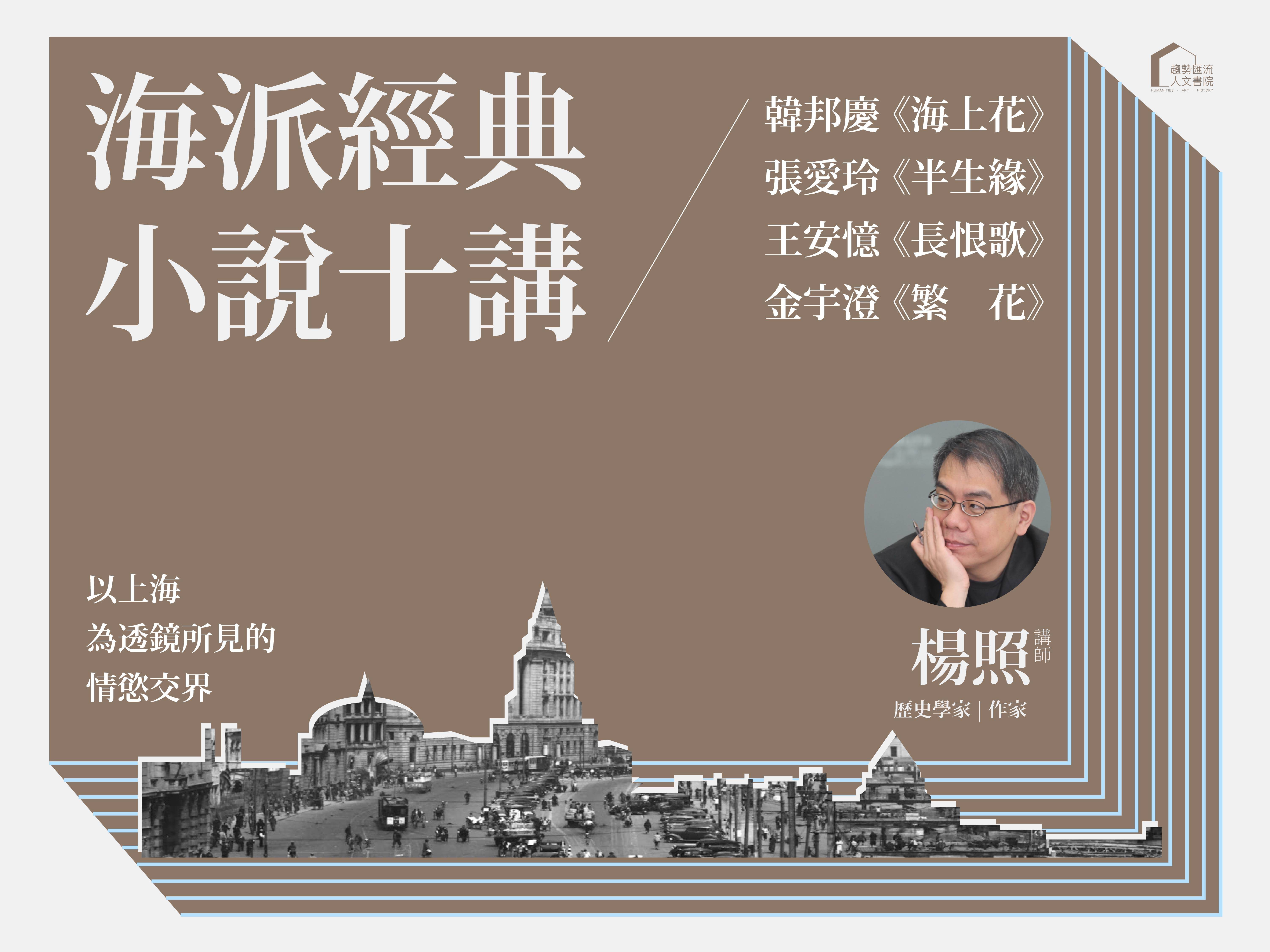 楊照老師將從海派小說壯闊流傳中精選四部傑作:韓邦慶的吳語小說『海上花』(搭配張愛玲的白話翻譯)、張愛玲的『半生緣』、王安憶的『長恨歌』和金宇澄的『繁花』,引領大家走訪一趟綿延想像中的上海情緣。